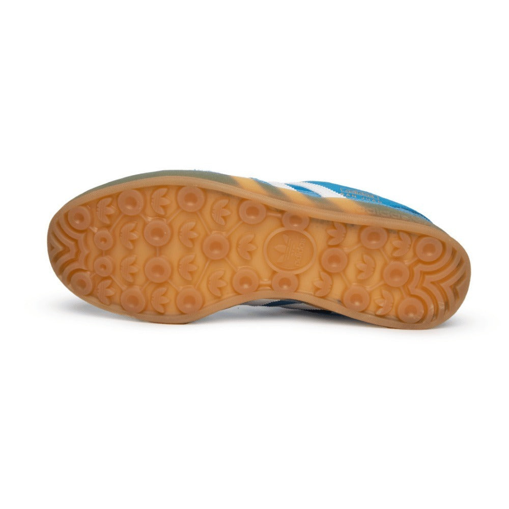 Inspired by the sunny skies and coastal energy of BB’s hometown, the Gazelle Indoor “San Juan” radiates tropical charm. The shoe features a vibrant blue leather upper with a perforated toe box and a signature asymmetric hairy suede overlay at the forefoot. White leather Three Stripes and gold “Ad San Juan” lettering add a touch of elegance, while the suede heel panel includes a visible size tag — a nod to BB’s playful design language. A semi-translucent gum sole completes the look, blending vintage Ad heritage with the artist’s unmistakable Caribbean flair.