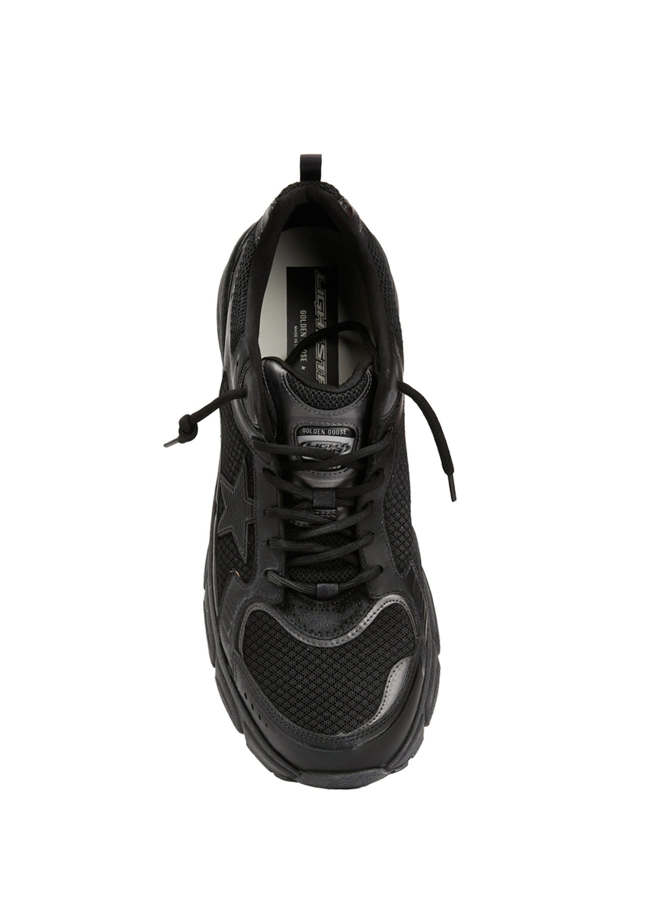 The GGS Lightstar Black Leather Mesh blends performance-inspired design with the brand’s iconic aesthetic. Made in Italy, it features a mix of mesh and calf leather with layered panels, tonal laces, and the signature star patch. The chunky rubber sole ensures comfort and durability, while the all-black finish delivers a bold, modern edge. Perfect for those who want GGS craftsmanship in a sportier silhouette.