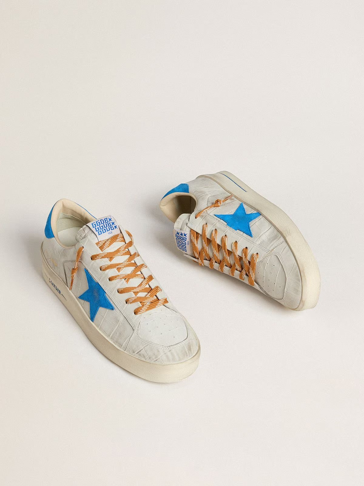 The GGS Stardan White Blue captures the spirit of the iconic ‘90s basketball era while adding a modern edge. This edition features a white croc-effect leather upper, accented with a light blue suede star and heel tab. Finishing the look, bold orange laces bring a fresh pop of contrast, making this pair a true standout.