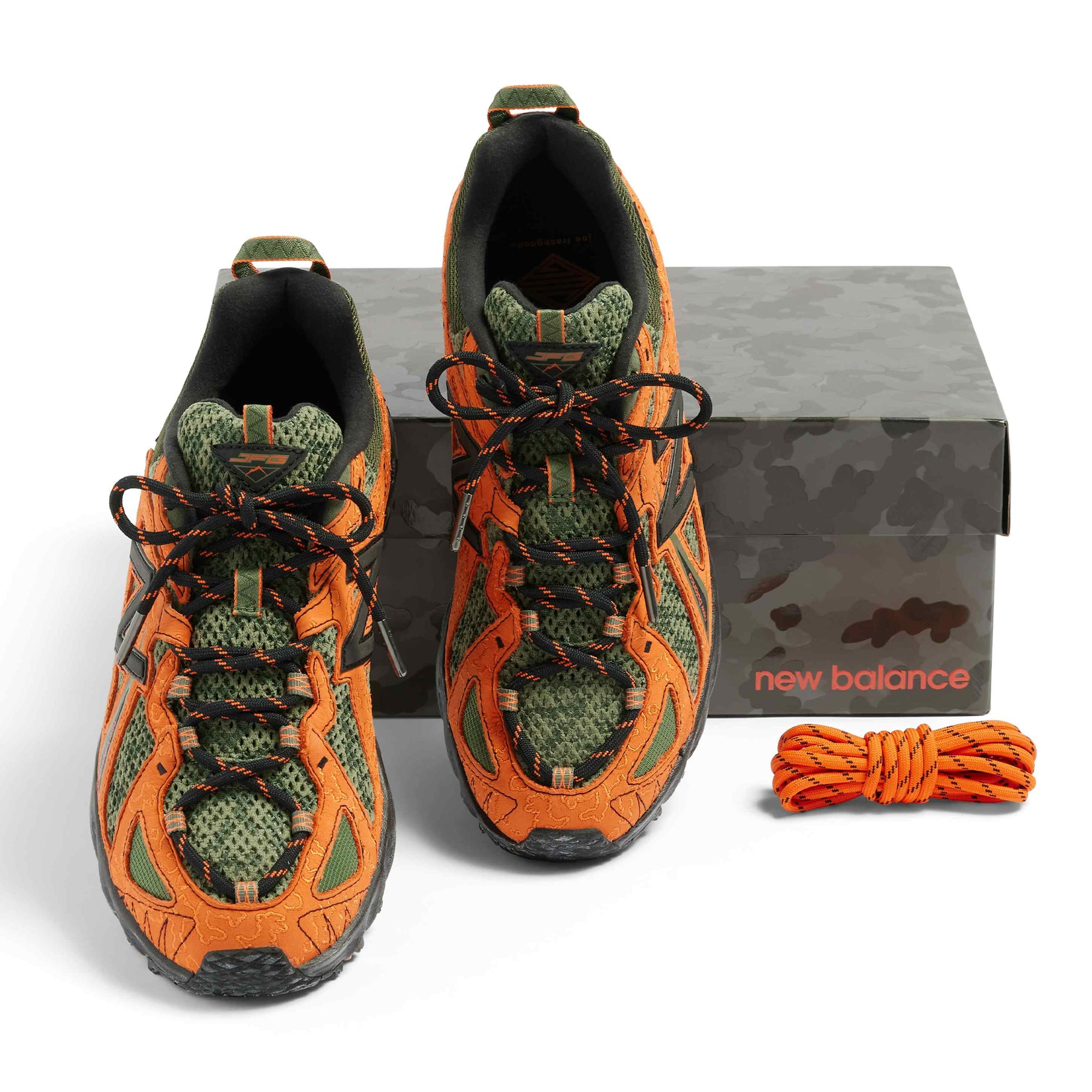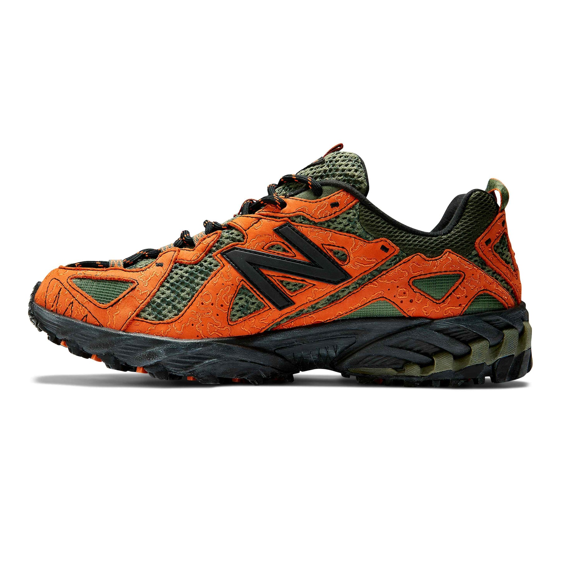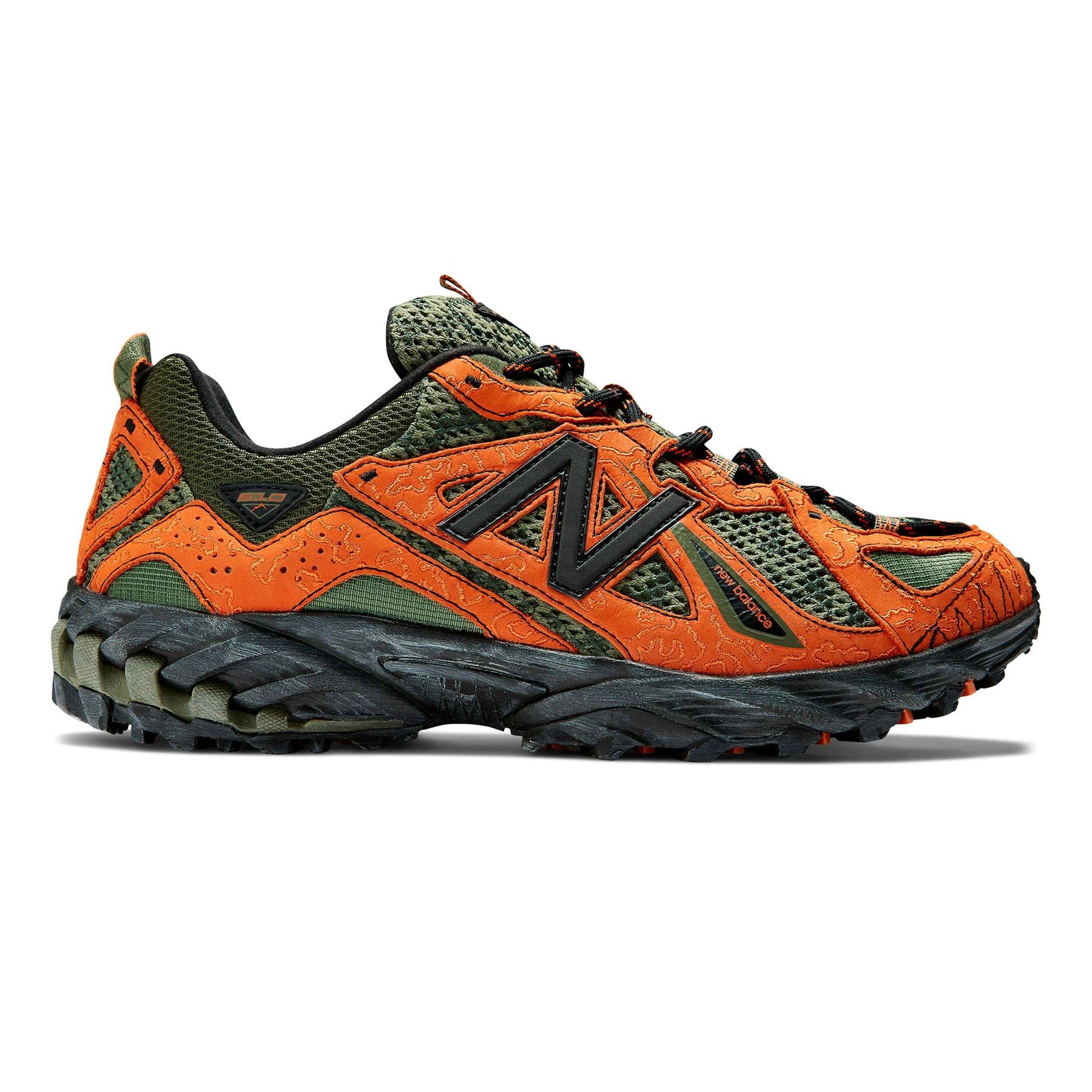 The JFG x NB 610 “Beneath the Surface – Lil’ Swamps” transforms the trail-inspired silhouette into a bold expression of Joe Freshgoods’ creative vision. Featuring a camouflage-pattern mesh upper in varied green tones, the design is accented with textured orange suede overlays arranged in irregular, organic shapes. A thin black “N” logo and distressed black midsole complete the rugged aesthetic, while pull tabs and trail-style construction ensure utility and comfort. A vibrant mix of art, performance, and storytelling from one of NB’s most distinctive collaborations.