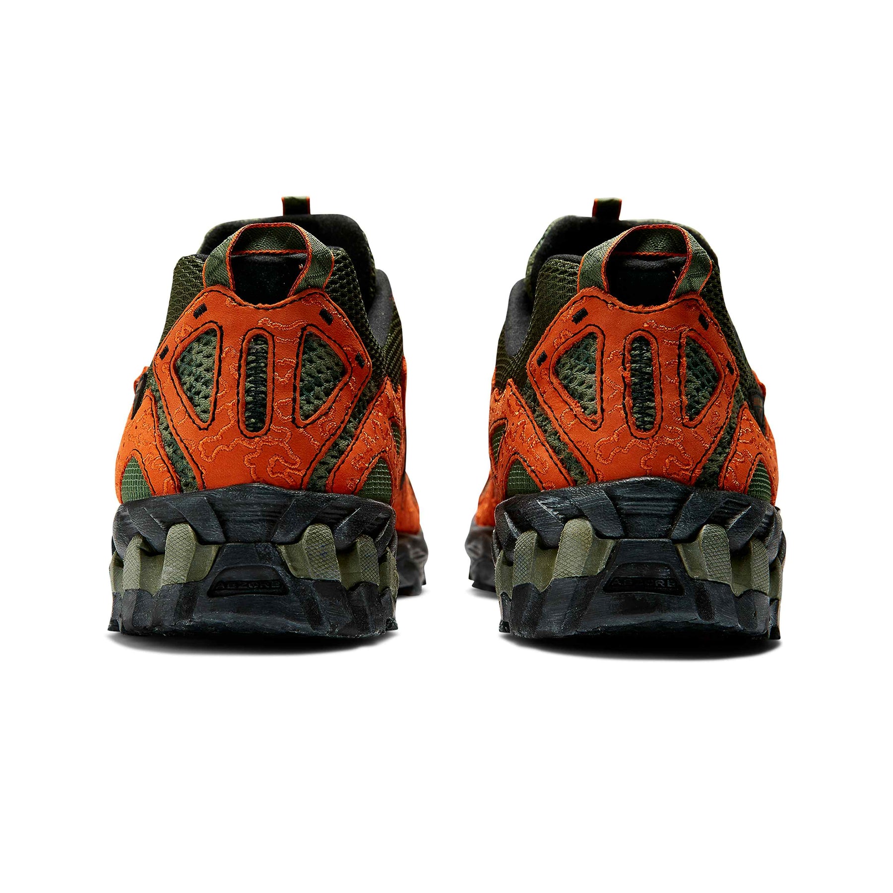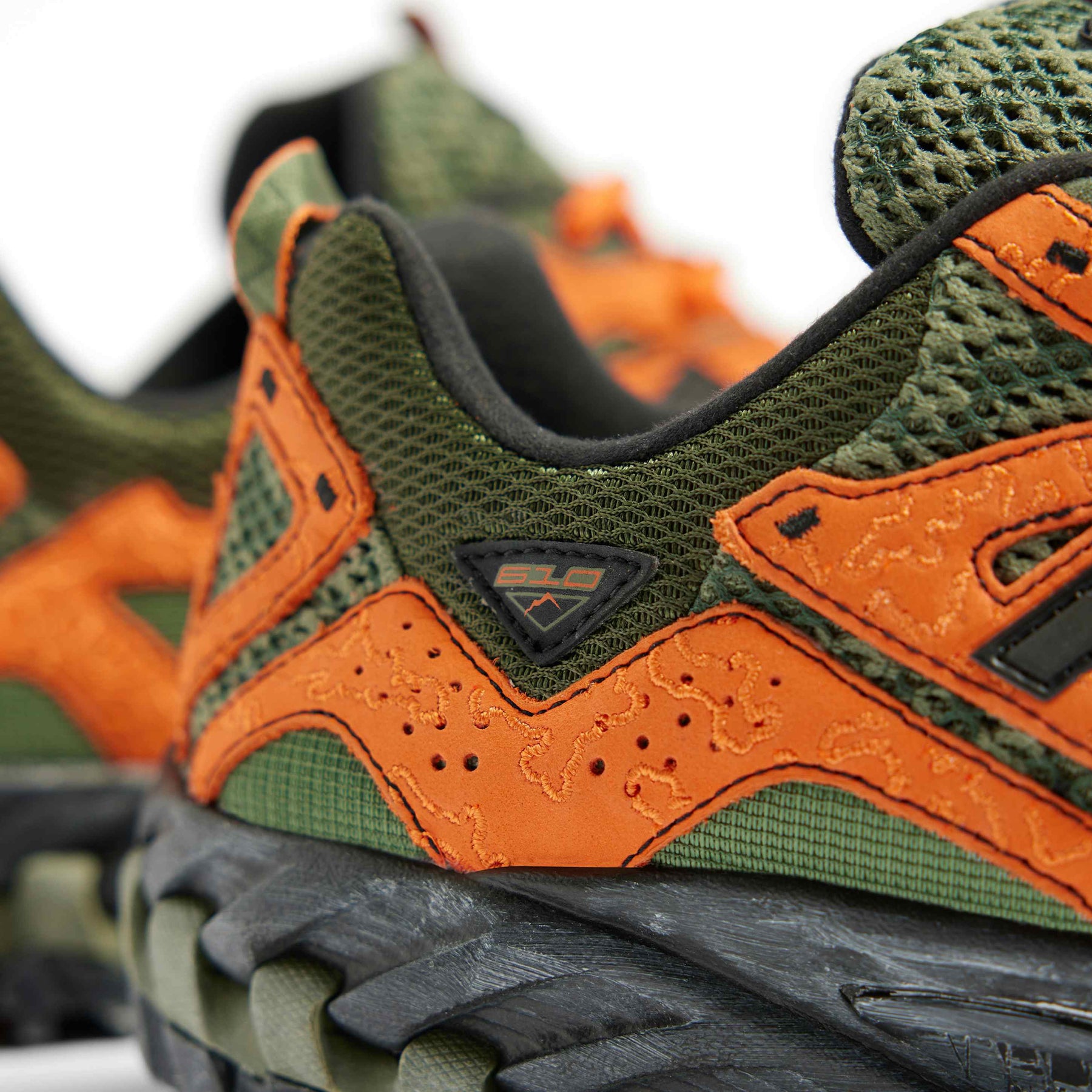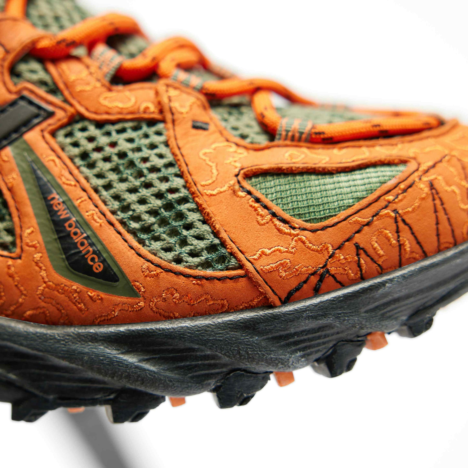 The JFG x NB 610 “Beneath the Surface – Lil’ Swamps” transforms the trail-inspired silhouette into a bold expression of Joe Freshgoods’ creative vision. Featuring a camouflage-pattern mesh upper in varied green tones, the design is accented with textured orange suede overlays arranged in irregular, organic shapes. A thin black “N” logo and distressed black midsole complete the rugged aesthetic, while pull tabs and trail-style construction ensure utility and comfort. A vibrant mix of art, performance, and storytelling from one of NB’s most distinctive collaborations.