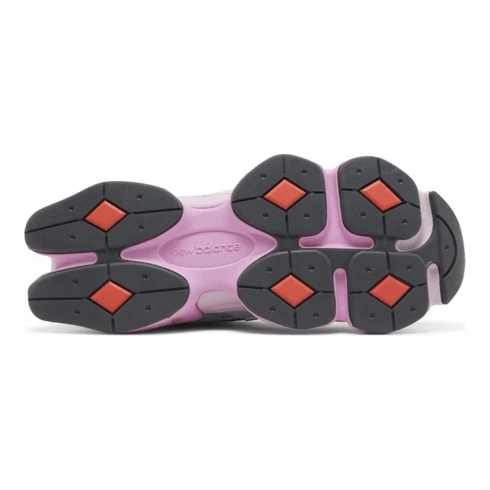 The NB 9060 “Warped” stands out with purple textile lines across a mint mesh upper, complemented by tonal leather and suede overlays. A yellow-and-orange “N” logo decorates the lateral side, while the opposite side features a stylized embroidered “N” in red and yellow. Fiery accents continue at the glossy TPU heel clip, adding to the bold aesthetic. Underfoot, lightweight comfort comes from a dual-density foam midsole in two shades of pink, delivering both cushioning and visual impact.