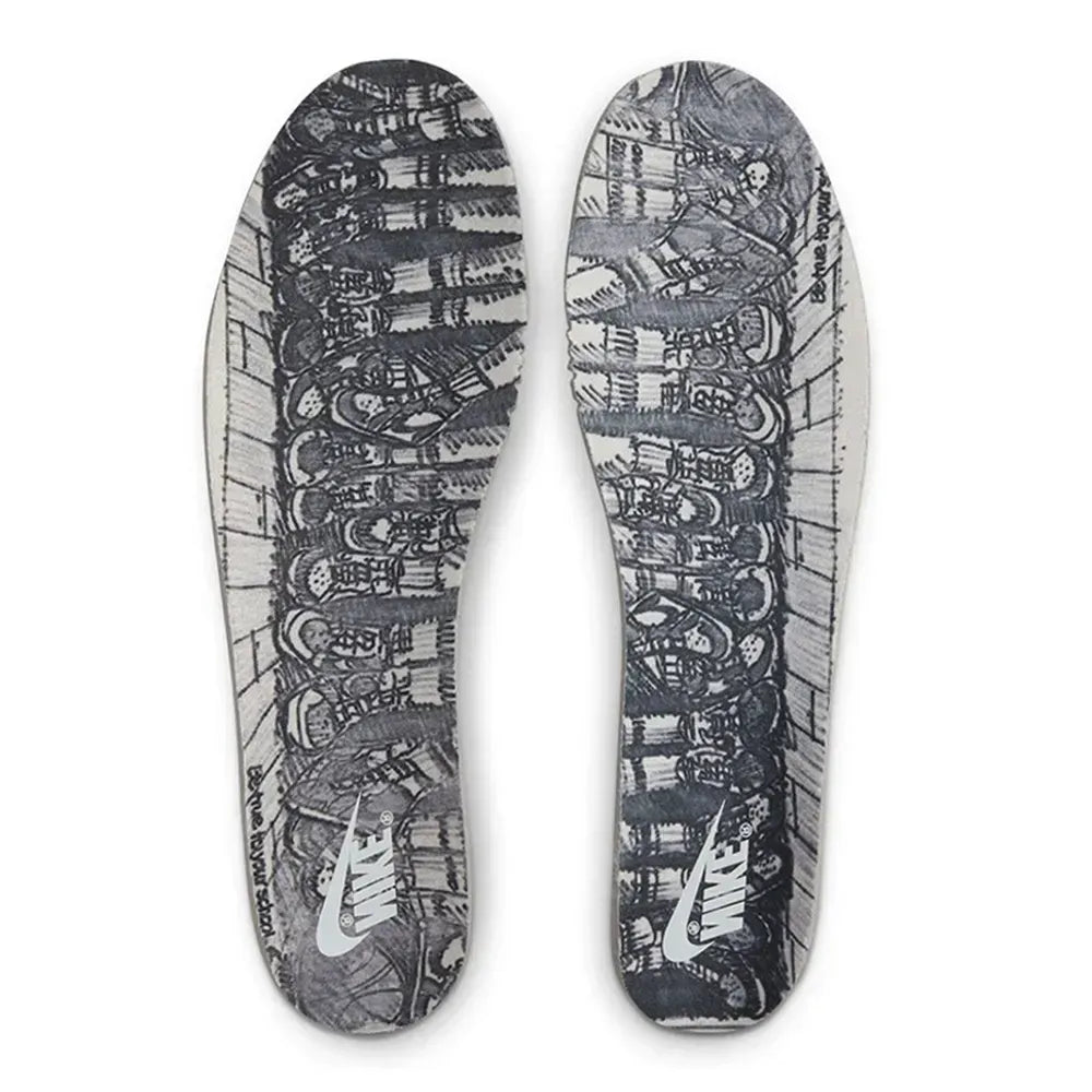 Wrapped in tear-away white material that conceals sketch-style artwork beneath, the pair invites wearers to reveal its hidden details over time. Purple and white alternating laces, gold branding on one tongue, and a contrasting purple outsole complete the eccentric yet refined look. A bold nod to sneaker culture’s past — and its future in constant reinvention.