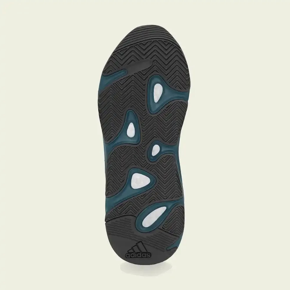 The Ad Yeezy Boost 700 V1 “Fade Azure” delivers one of the boldest takes on the classic chunky silhouette. The upper combines suede, mesh, and leather in striking shades of teal and aqua, contrasted by a deep blue midsole with bright orange oval accents for a pop of energy.